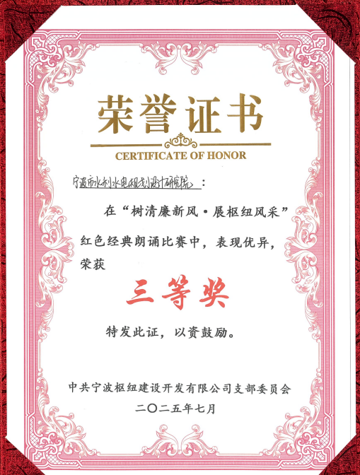 為慶祝中國共產黨成立104周年,2025年7月1日,寧波樞紐建設開發有限公司隆重舉行了“紅動樞紐·同心共建”迎“七一”主題黨建活動。作為寧波樞紐片區重要參建單位和黨建聯盟成員,我院黨總支書記、副院長王洪霞帶隊參與了本次活動,并且,我院兩位青年職工攜選送作品在“樹清廉新風·展樞紐風采”樞紐片區紅色經典朗誦比賽中榮獲三等獎。
