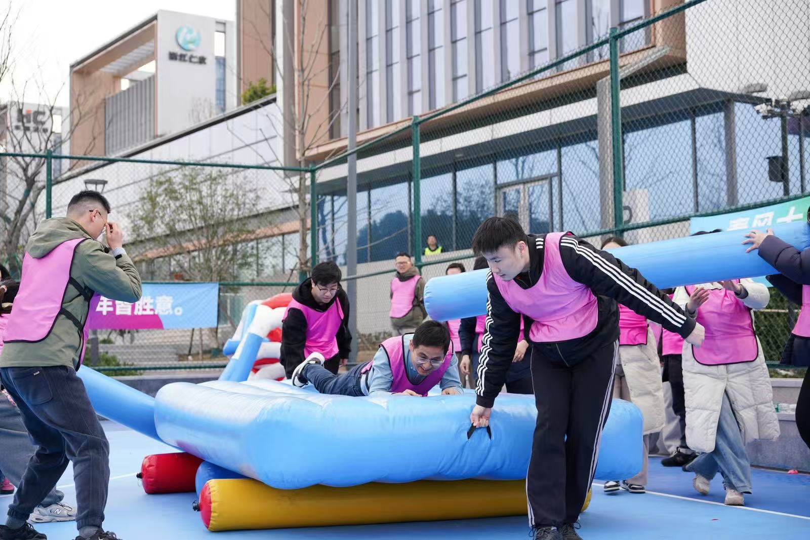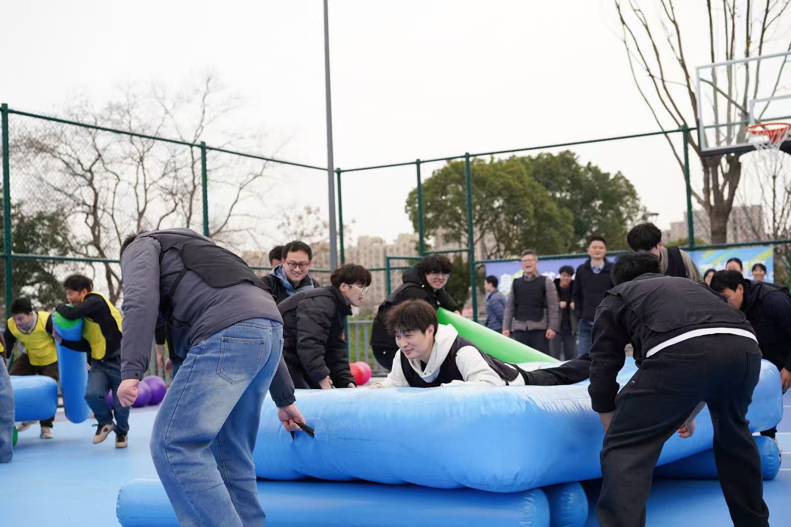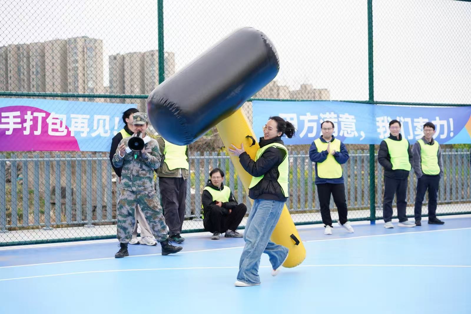 “勇立潮頭”考驗的是反應與穩定,隊員們圍成圓圈快速移動,同步接住充氣柱,1分鐘內有效移動次數不斷刷新。“超級NBA”中,大家用瑜伽球投籃,雖姿勢各異,但進球瞬間的歡呼同樣熱烈。“乘風破浪”要求隊員在充氣墊上接力鋪設充氣棒,讓體重不輕于75kg的“重量級”選手穩坐墊上,隊友們默契配合,如乘風破浪般前行。最后的“巨人腳步”由每隊兩名領隊腳穿巨型鞋蹼接力奔跑,滑稽的動作引來全場笑聲不斷。