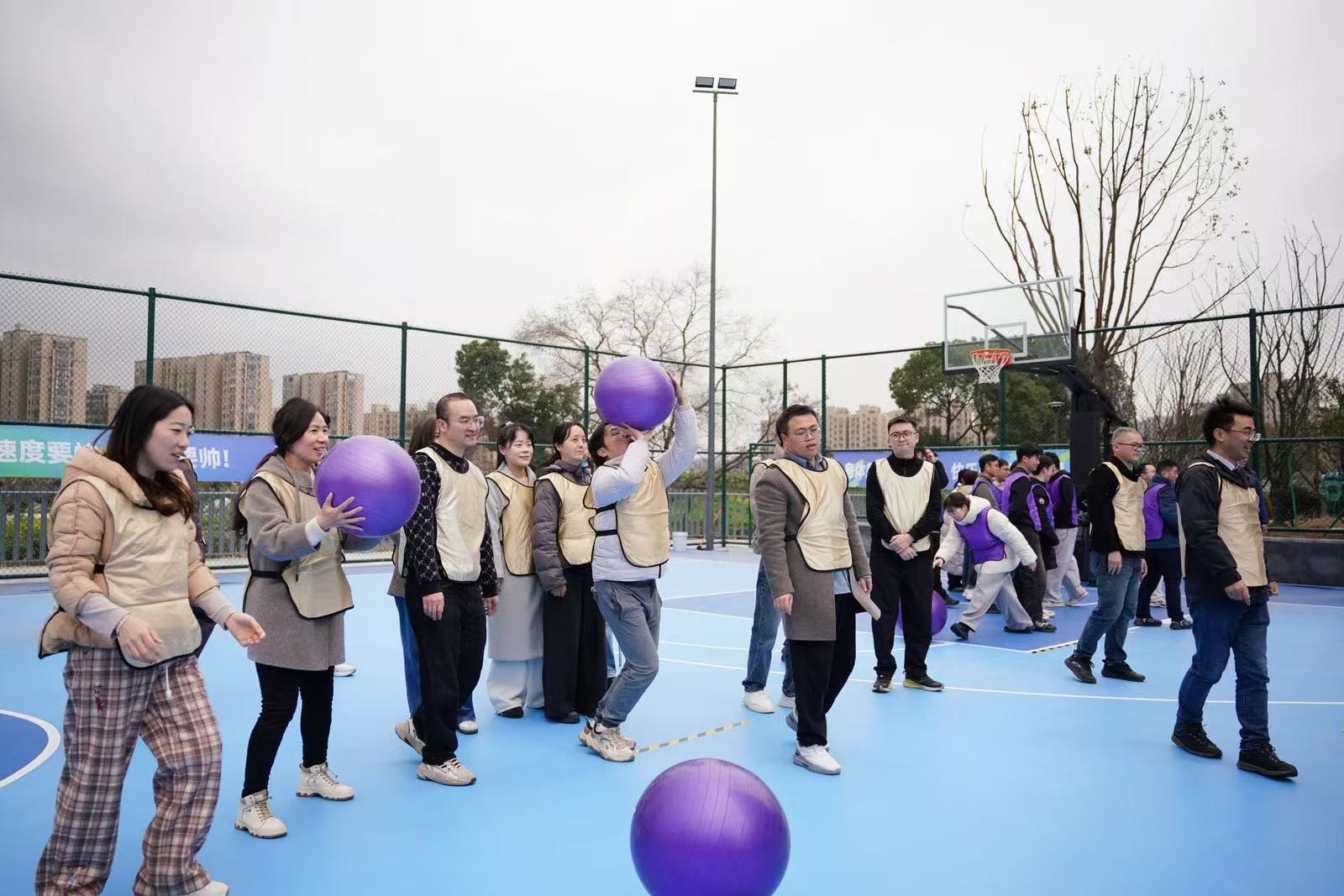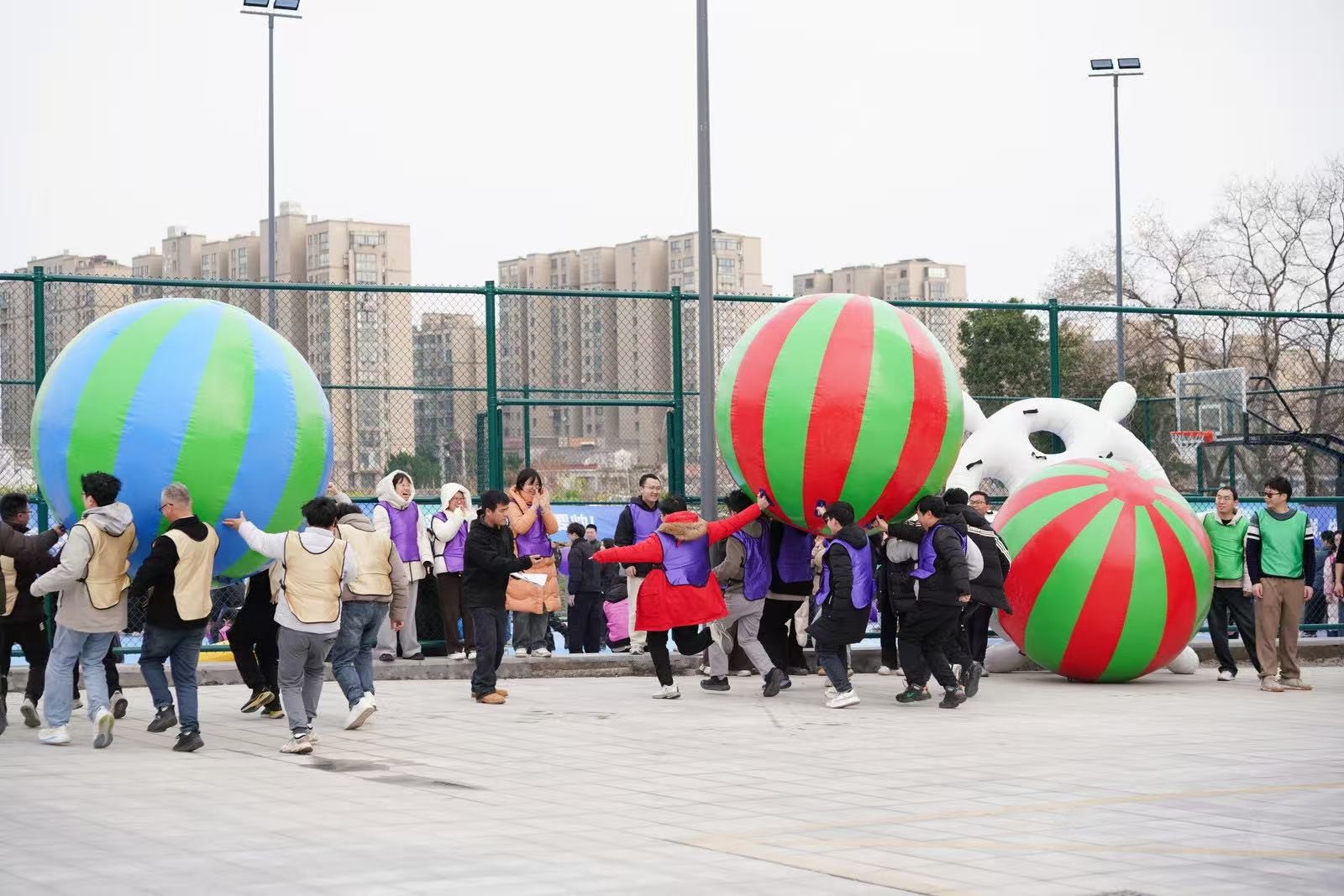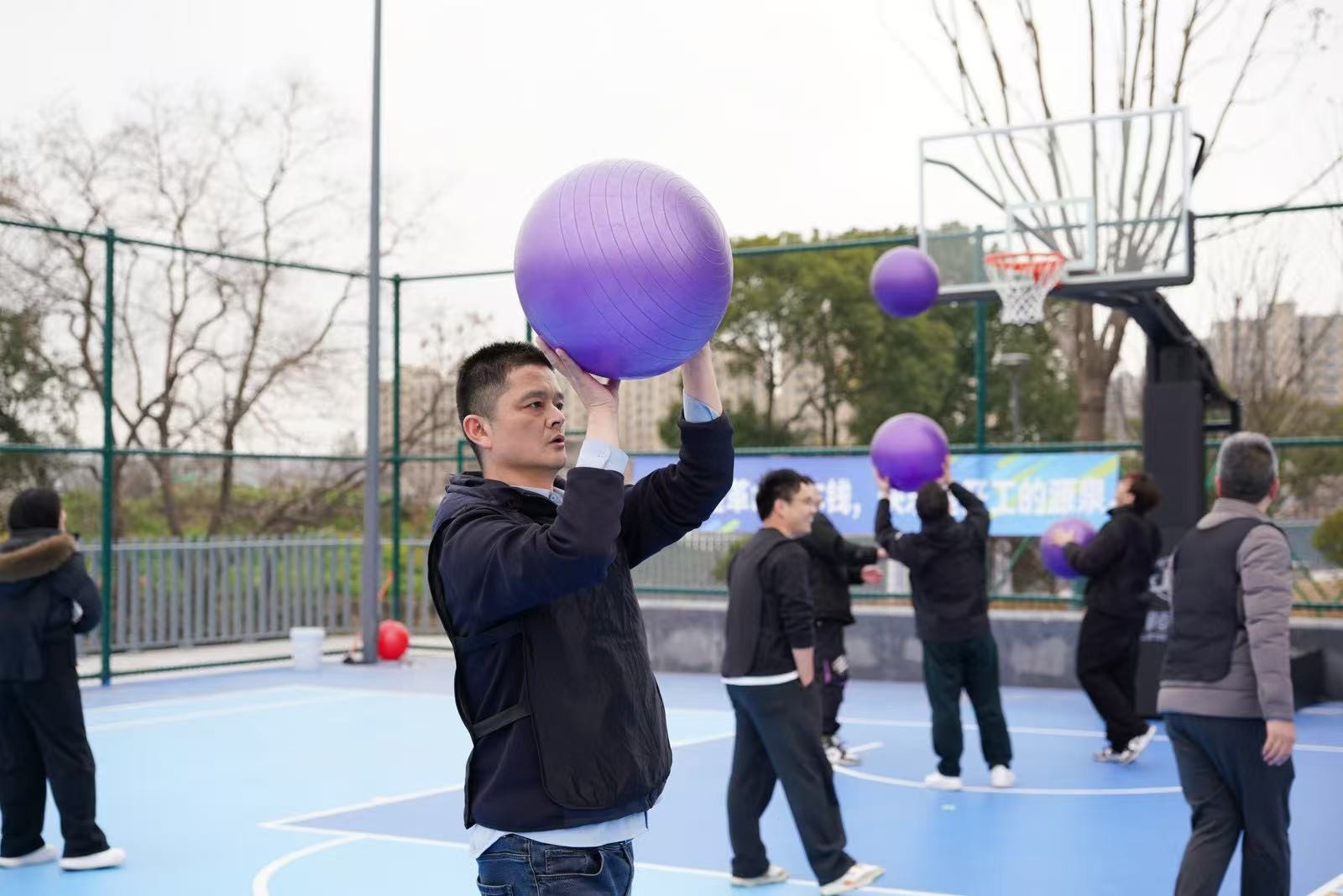 “勇立潮頭”考驗的是反應與穩定,隊員們圍成圓圈快速移動,同步接住充氣柱,1分鐘內有效移動次數不斷刷新。“超級NBA”中,大家用瑜伽球投籃,雖姿勢各異,但進球瞬間的歡呼同樣熱烈。“乘風破浪”要求隊員在充氣墊上接力鋪設充氣棒,讓體重不輕于75kg的“重量級”選手穩坐墊上,隊友們默契配合,如乘風破浪般前行。最后的“巨人腳步”由每隊兩名領隊腳穿巨型鞋蹼接力奔跑,滑稽的動作引來全場笑聲不斷。