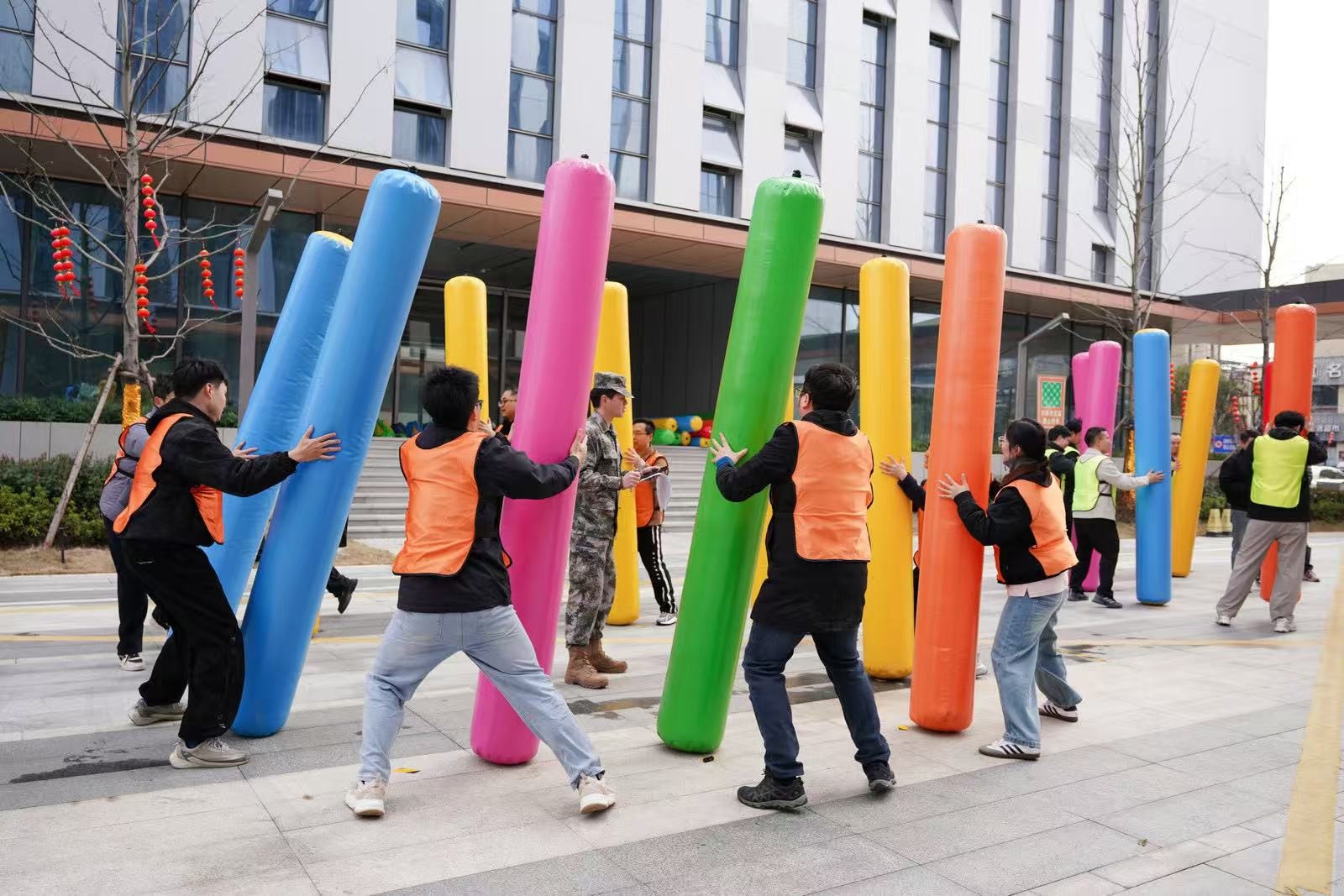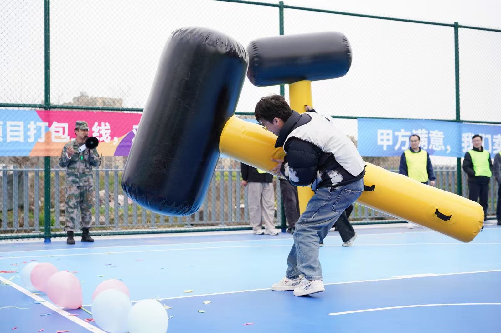 在“南水北調”項目中,隊員們手持PVC管接力運水,5分鐘內爭分奪秒,讓水流在管中傳遞涌向重點,仿佛將團隊的信任與責任匯聚成河。“龜兔賽跑”則讓隊員們化身可愛的“烏龜”和“兔子”,在賽道上你追我趕,妙趣橫生。“鴻運亨通”需要8人共同托舉大球折返跑,大家步調一致,齊頭并進。“一錘定音”環節,隊員們揮動充氣大錘敲破氣球,每一聲“砰”響都引來陣陣喝彩。